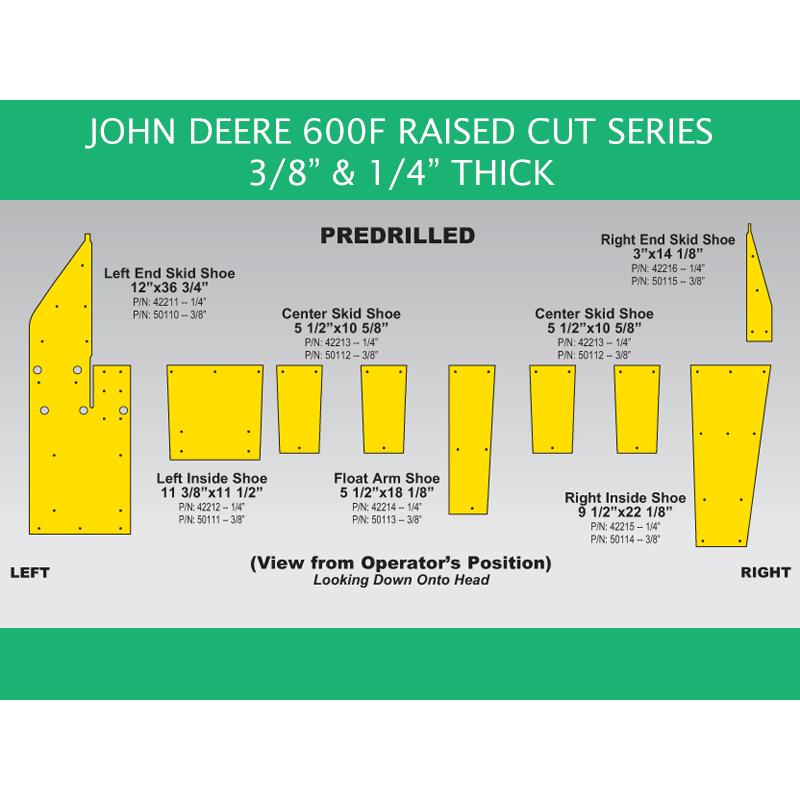 Poly Skid Shoes for John Deere Raised Cut 600F Series. Includes hardware; size 88 small head pop rivets.
