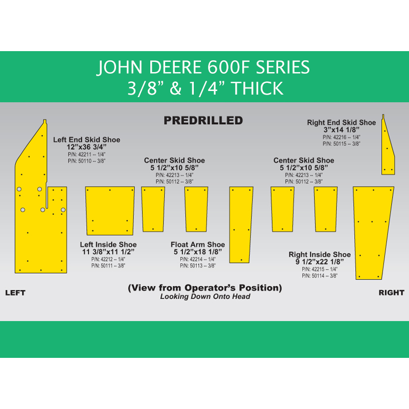 Poly Skid Shoes for John Deere 600F Series. Includes hardware; size 88 small head pop rivets.