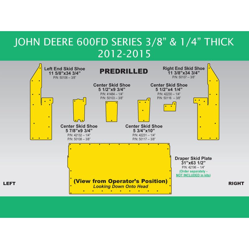 Model year 2013-2014 Poly Skid Shoes for John Deere 600FD Series. Includes hardware; size 88 small head pop rivets.
