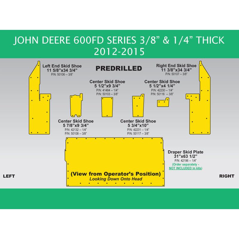 Model year 2015 Poly Skid Shoes for John Deere 600FD Series. Includes hardware; size 88 small head pop rivets.