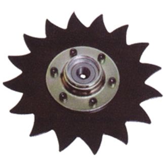Notched covering disc for IH planters, fits late model 800 series with covering disc held on with hex bolt and nut; all 900, 950, 955 and 1200 series; 5400, 5500 Soybean Special.