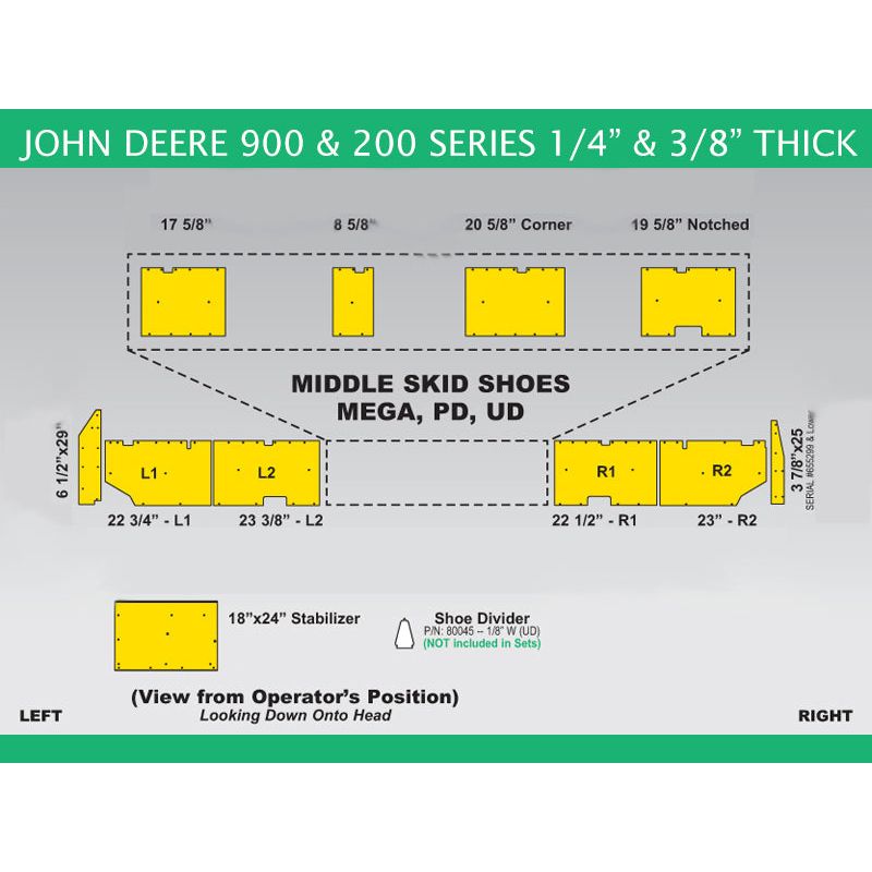 Poly Skid Shoes for John Deere 900F Series. All Hardware is included; size 10-16 pound rivets.