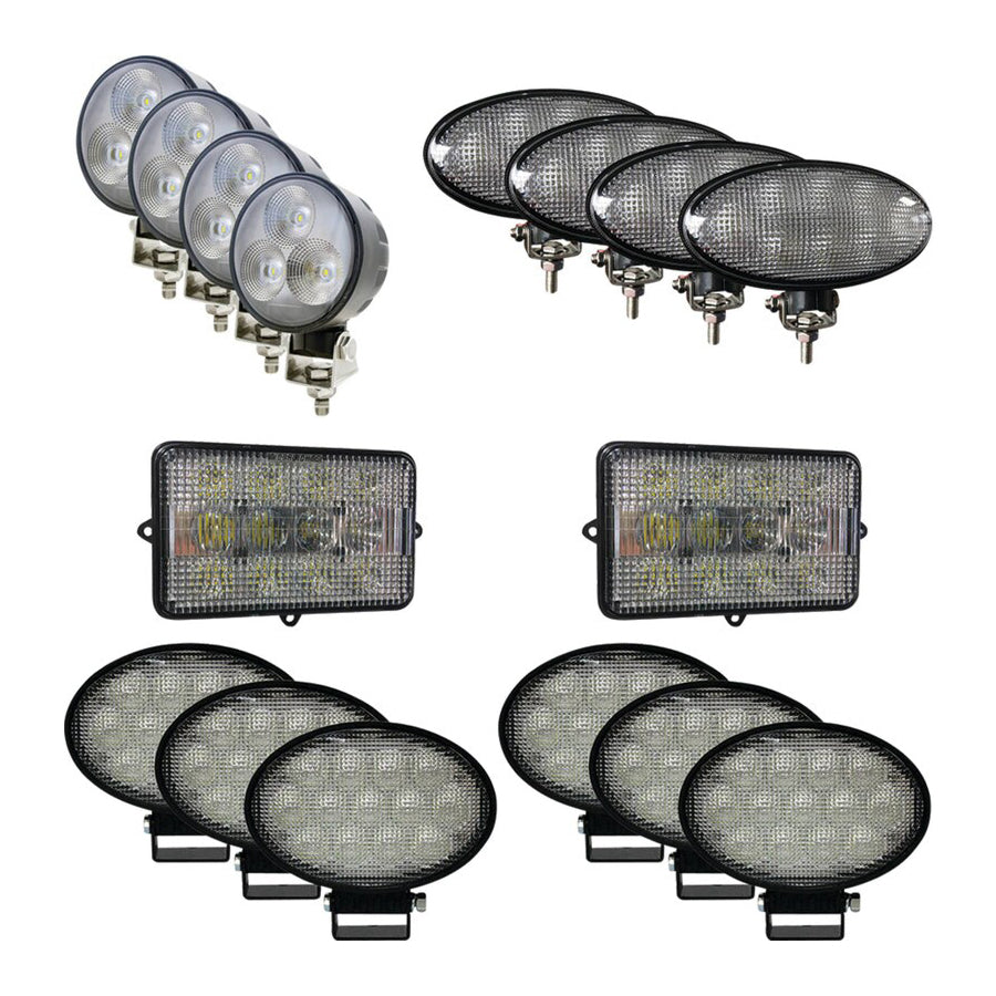 Complete LED Light Kit for John Deere S, T & W Series Combines with Large Oval Cab Lights. Uses original mount and wiring. Stainless Steel Hardware, and Connectors.